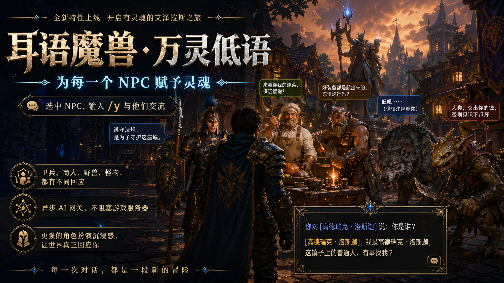 简单来说,从现在开始,你可以尝试和艾泽拉斯世界里的 NPC “真正说话”了。